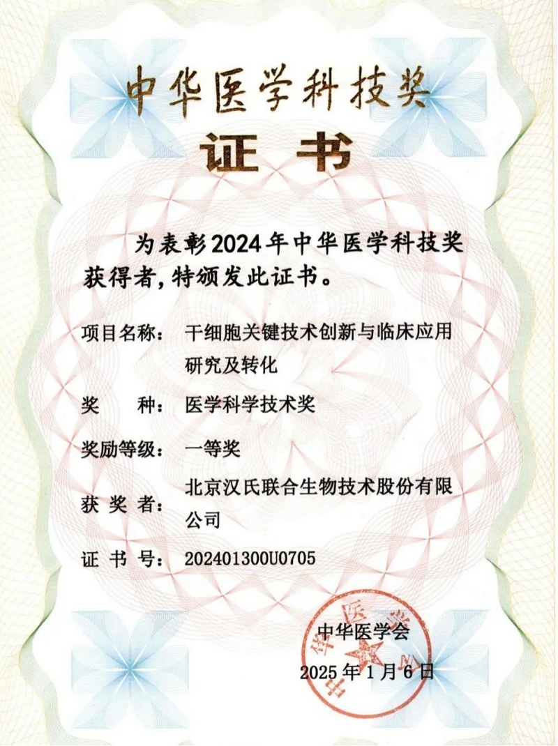 汉氏联合:与贵州医科大学等合作单位共同申报的“干细胞关键技术创新与临床应用研究及转化”项目,凭借其卓越的创新性与实践价值,荣获中华医学科技奖一等奖。迄今为止,汉氏联合科研团队已累计荣获国内外权威科技类奖项约30项,彰显了其在细胞科研领域的卓越实力。
