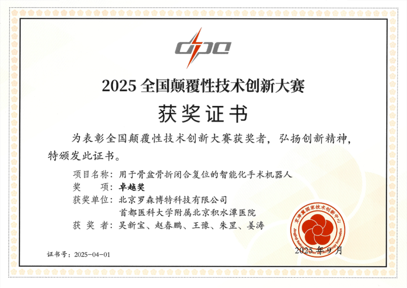 罗森博特成立于2017年,专注于智能医疗领域原始创新,以临床刚需为驱动,深度医工交叉为基础,致力于成为伟大的原创智能医疗产品和服务供应商。其核心产品罗森万相®智能化骨科手术机器人系统是通过积水潭医院临床团队、北航科研团队以及罗森博特工程师们十多年的深度医-工-企结合、原研创新,最终在全球范围率先实现了在最高难度的骨盆骨折手术中的临床应用,填补了“骨科手术机器人全流程辅助闭合复位、微创固定”的国际空白。目前该系统已在全国22个省市,47家三甲医院投入使用,成功开展600+例复杂骨盆及长骨骨折闭合复位内固定手术,手术效果良好,获得了临床专家的一致认可。
