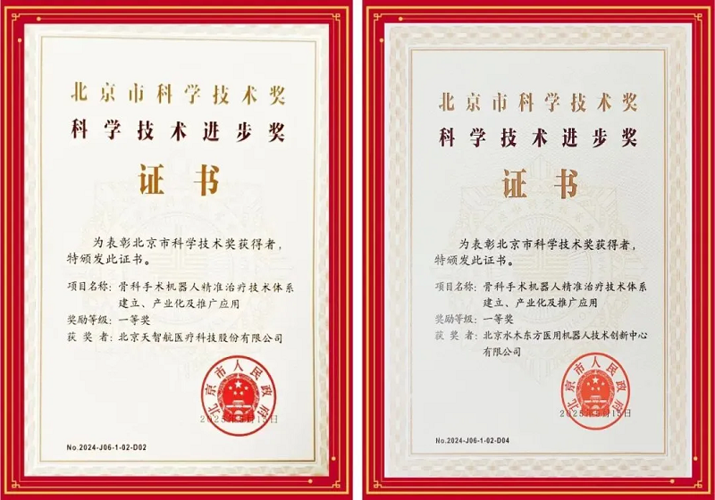 天智航、水木东方联合首都医科大学附属北京积水潭医院等单位共同完成的“骨科手术机器人精准治疗体系建立、产业化及推广应用”项目,荣获2024年度北京市科学技术奖科技进步一等奖。