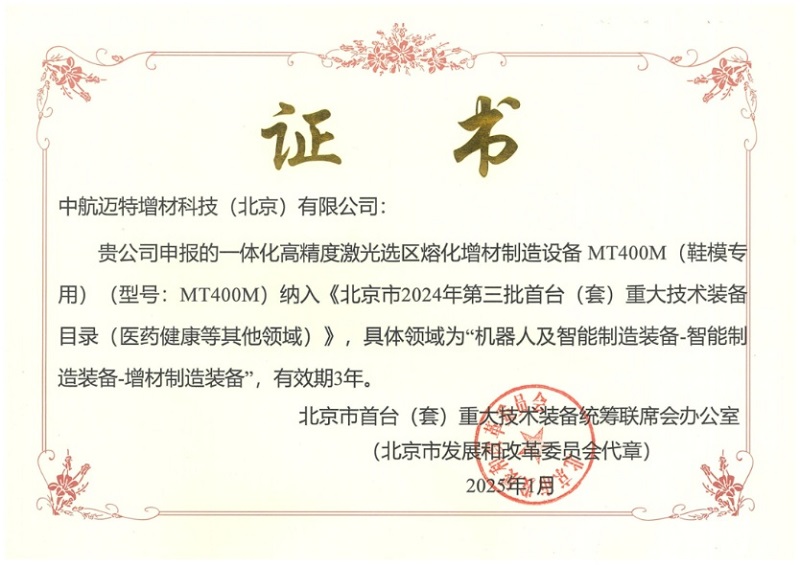 中航迈特:一体化高精度激光选区熔化(SLM)设备MT400M成功获得北京市首台(套)重大技术装备认定,已应用于3C、鞋模等多个领域,实现核心装备国产化替代。